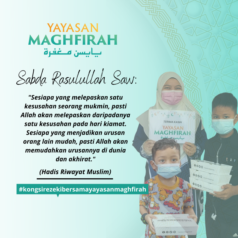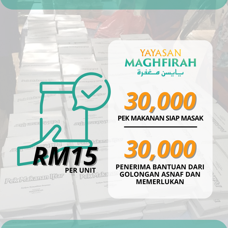 Dengan rasa syukur, tim Yayasan Maghfirah ingin mengajak saudara saudari untuk berkongsi rezeki dengan menyalurkan pek makanan siap masak kepada mereka yang memerlukan dan terjejas pendapatannya, khususnya buat golongan asnaf, ibu tunggal, golongan oku, warga emas, pusat kebajikan hospital dan mahasiswa di sekitar ibu kota.